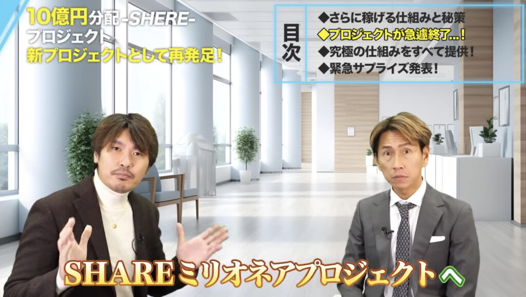 SHAREはLPや動画上では稼げと納得できるだけの仕組みや具体的な手法についての情報はないまま進みますが、3つ目の最後の動画で急に、「10億円分配プロジェクトは終了します」「その代わりこの動画をご覧の方限定でさらに稼げるSHAREミリオネアプロジェクトへ限定招待します」という流れになります。